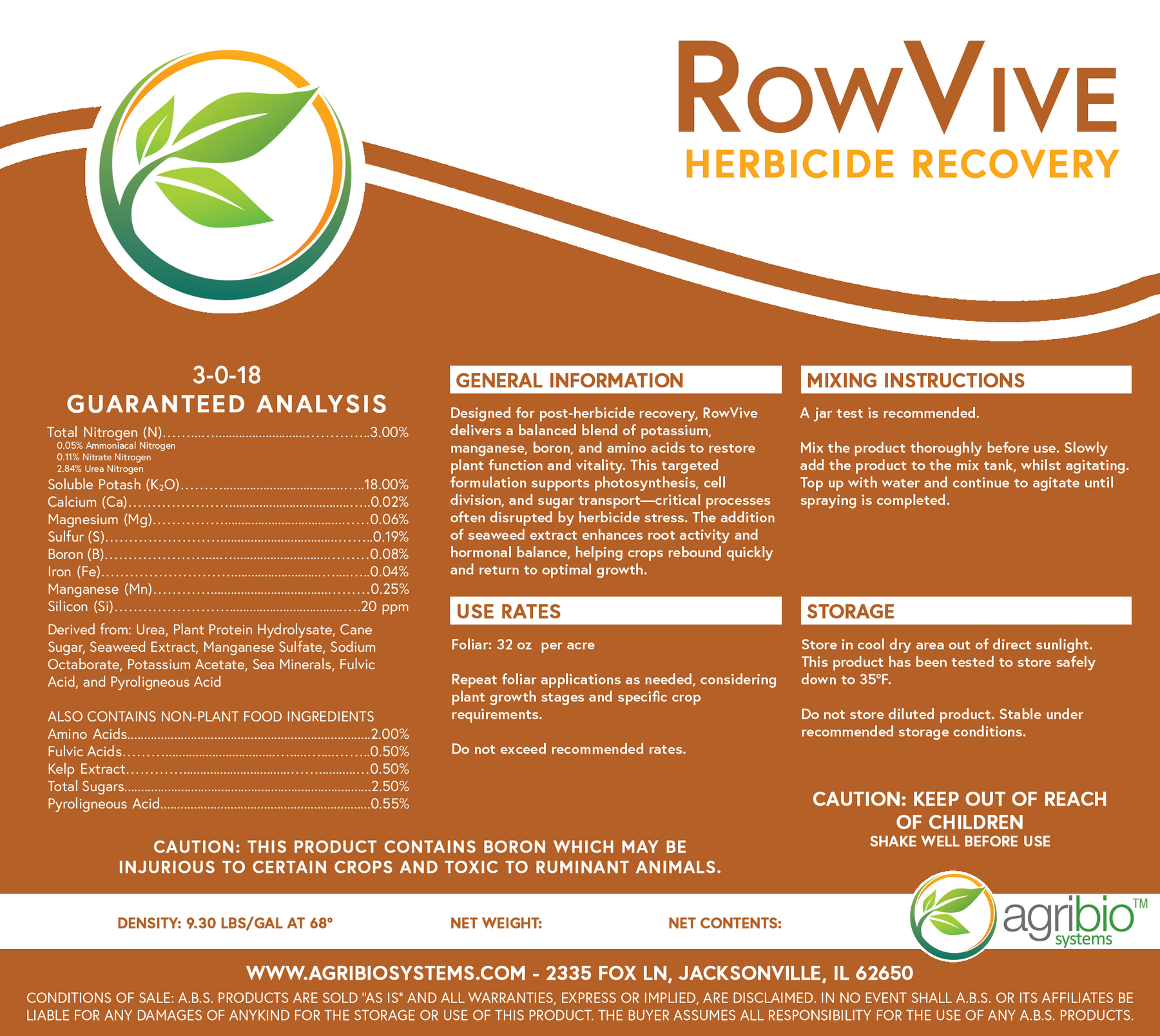 This foliar solution delivers a balanced blend of potassium, manganese, boron, amino acids, and supporting bioactives that target the key processes disrupted by herbicide stress. By promoting photosynthesis, cell division, and sugar transport, RowVive ensures plants regain energy, balance, and resilience when they need it most.
