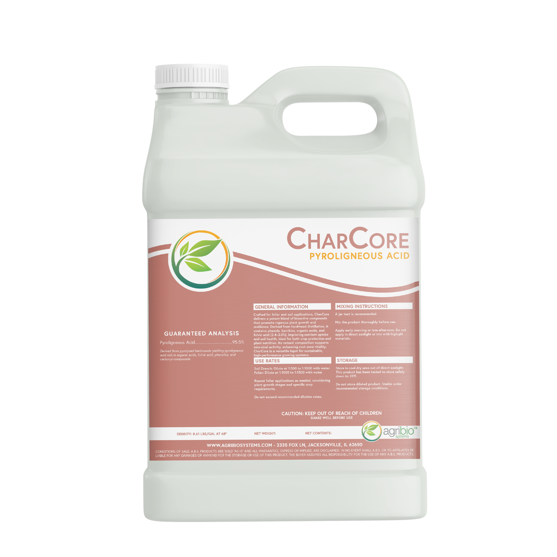 Crafted for both foliar and soil applications, CharCore is a concentrated source of bioactive compounds designed to strengthen plant growth, resilience, and overall system performance. CharCore is a pyroligneous acid, also known as wood vinegar, distilled from hardwood. This unique formulation delivers a spectrum of beneficial molecules — including phenols, karrikins, organic acids, and fulvic acid (2.4–3.0%) — that work together to improve nutrient use efficiency, stimulate beneficial biology, and enhance soil function.