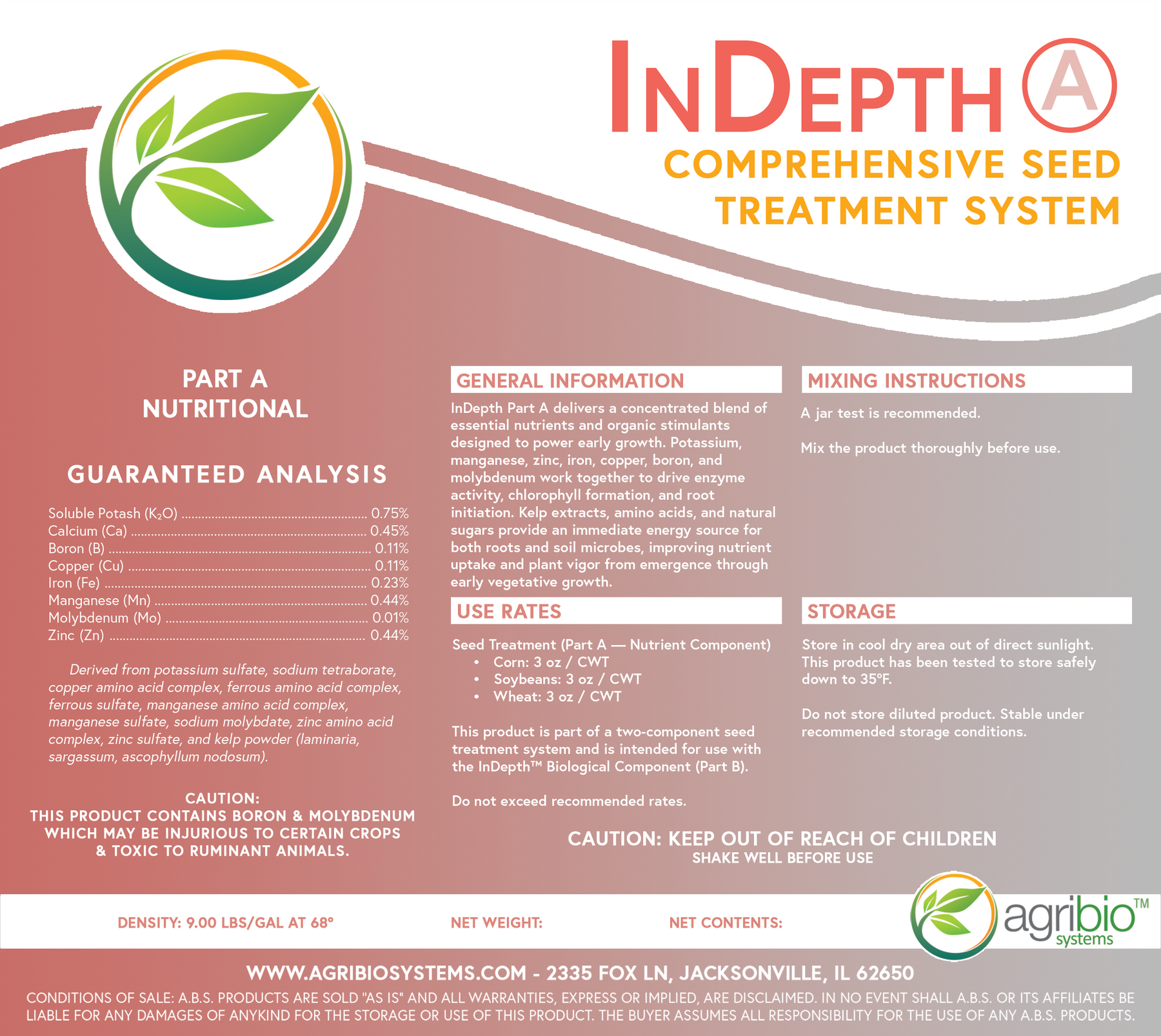 InDepth is designed for seed treatment applications and is applied at a total rate of 6 ounces per hundredweight (cwt) of seed.