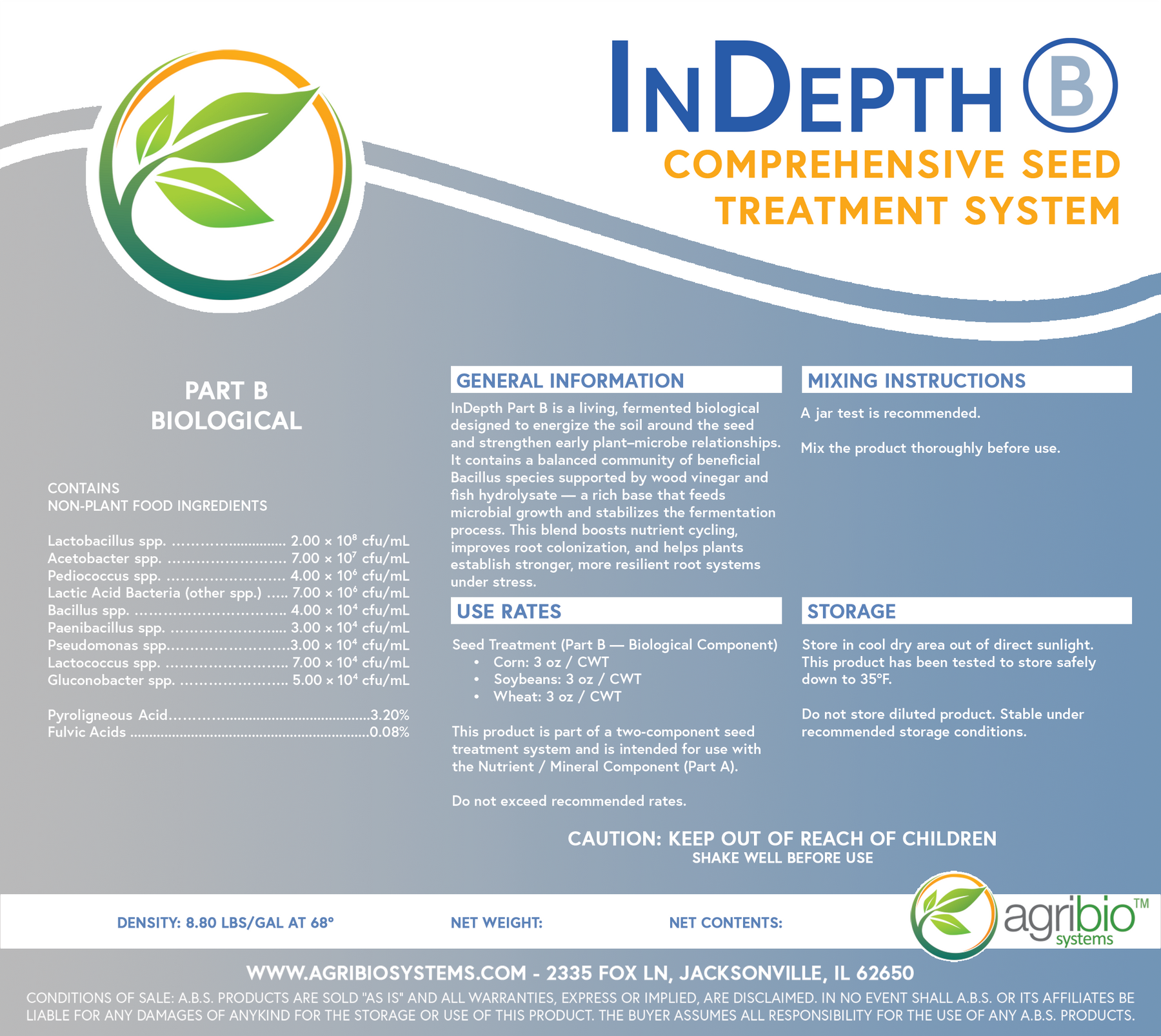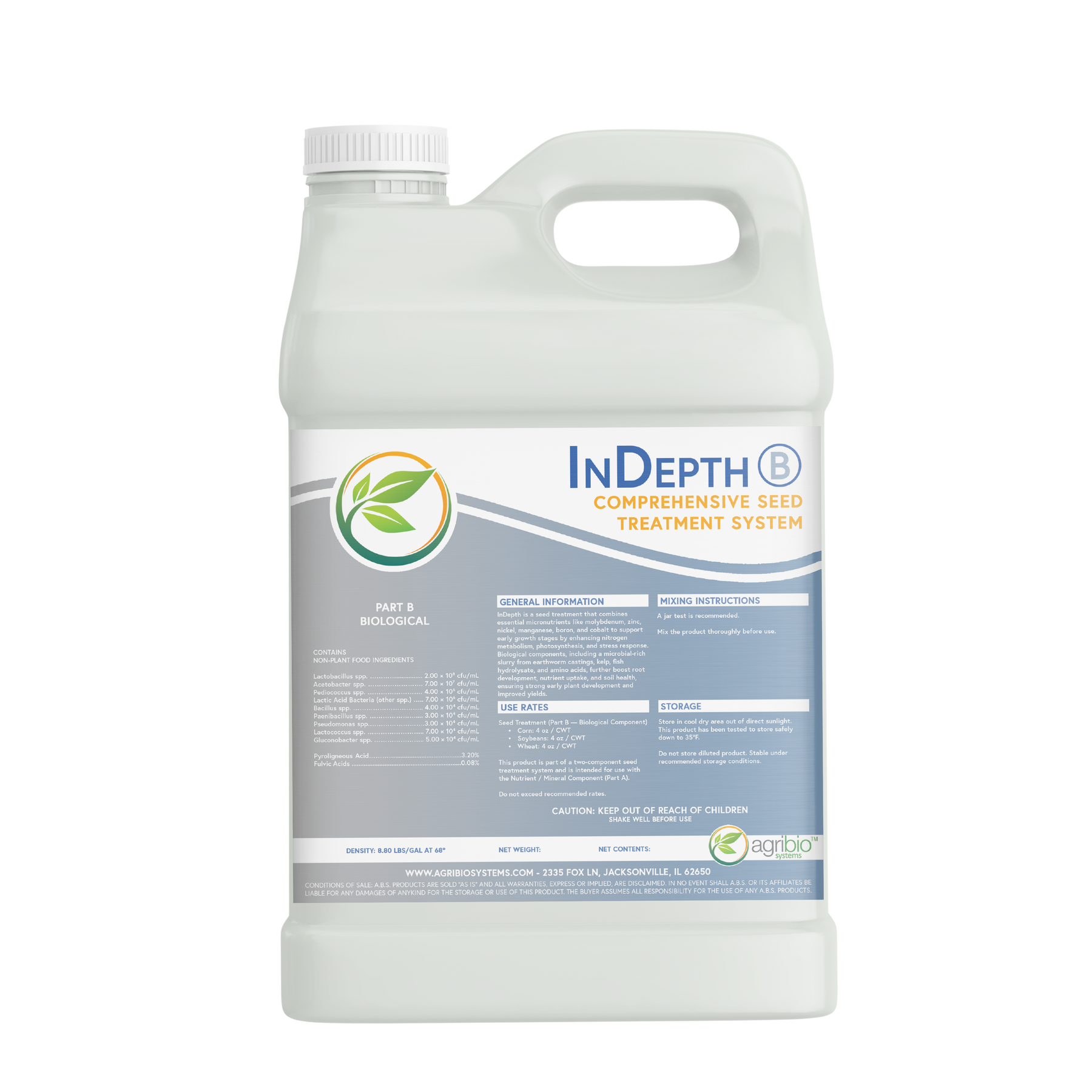 InDepth delivers two complementary components working together in the seed zone. Part A provides targeted micronutrients and plant stimulants that activate plant metabolism and enzyme pathways. Part B delivers a living fermented biological system built around beneficial Bacillus species that rapidly colonize the rhizosphere and support nutrient cycling.